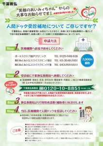 各々の医療機関に予約後、千葉教弘にご連絡ください。(年1回の補助とします)